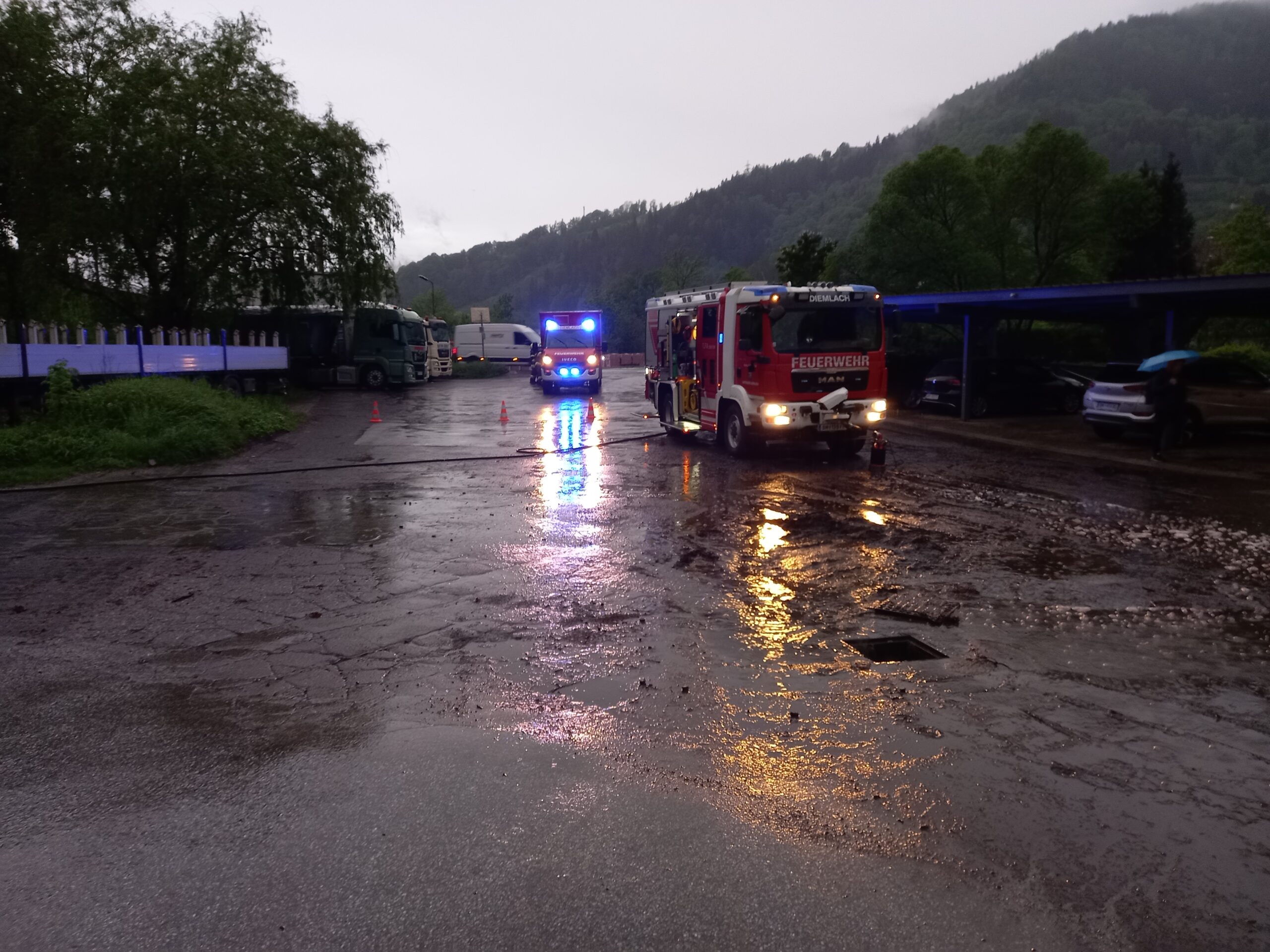Am Einsatzort stellte sich heraus, dass eine komplette Unterführung und eine Werkszufahrt unter Wasser stand und ein angrenzendes Wohnhaus bedrohte.