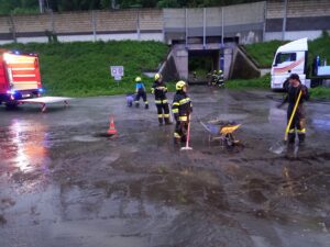 Das Wasser musste mittels Tauchpumpen und Schmutzwasserpumpen abgepumpt werden. Danach wurde die Unterführung sowie die Straße vom Schlamm befreit.