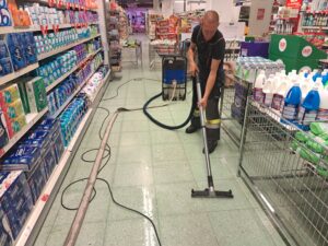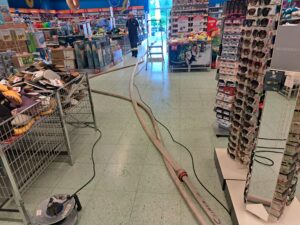 Durch die starken Regenfälle waren Teile des Verkaufsraumes überflutet wurden. Mittels Nasssauger konnte das Wasser abgesaugt werden.