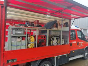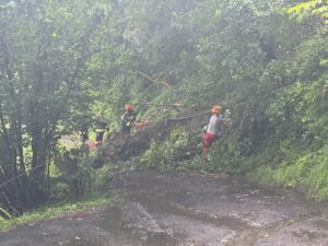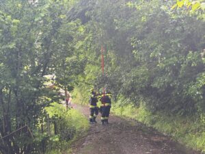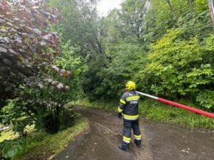 Noch während des Pumpeinsatz erreichte uns ein zweiter Einsatz. Mehrere Bäume sind auf eine Stromleitung gestürzt. Auch diese Einsatz wurde von den eingesetzten Kräften abgearbeitet.