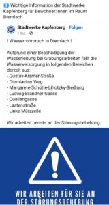 Am Mittwoch, 17.09.2025 wurde die FF Kapfenberg-Diemlach um 11:30 Uhr zur Wasserversorgung aufgrund eines Wasserrohrbruches im Raum Diemlach alarmiert. Durch Bauarbeiten wurde die Hauptwasserleitung beschädigt. Während der Reparaturarbeiten stellte die FF Kapfenberg-Diemlach für die Bevölkerung die Wasserversorgung sicher. Nach ca. 4 Stunden konnte der Einsatz beendet werden.