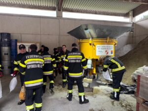 Übungsort war diesmal die Kläranlage in Bruck, wo wir die Sandsackfüllmaschine der FF Bruck besichtigten und beüben durften. Dies nutzten wir ebenfalls, um Sandsäcke im Rüsthau bereitzustellen.